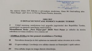 Menadžment firme “Novi Pazar put” DOO odlučio je danas da donira 15.000 evra pomoći stradalima u Turskoj.